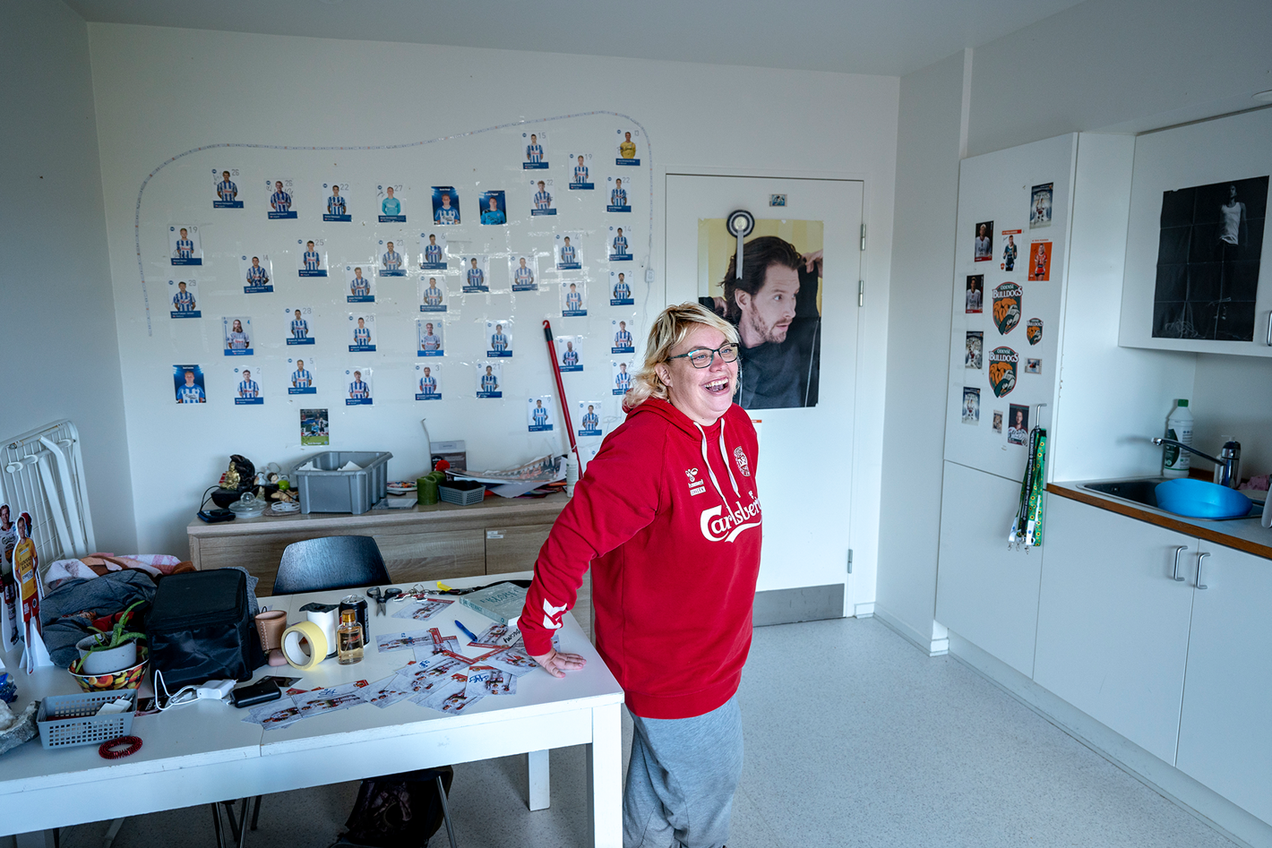 Og rigtigt nok er hendes lejlighed på Grevenlund plastret til med billeder af OB-fodboldspillere. De fylder hele den ene væg i hendes lille toværelses lejlighed, og der er endda autografer på enkelte af dem. Også store plakater af det lokale håndboldhold, ishockeyhold og Rasmus Seebach pryder de hvide vægge i lejligheden.