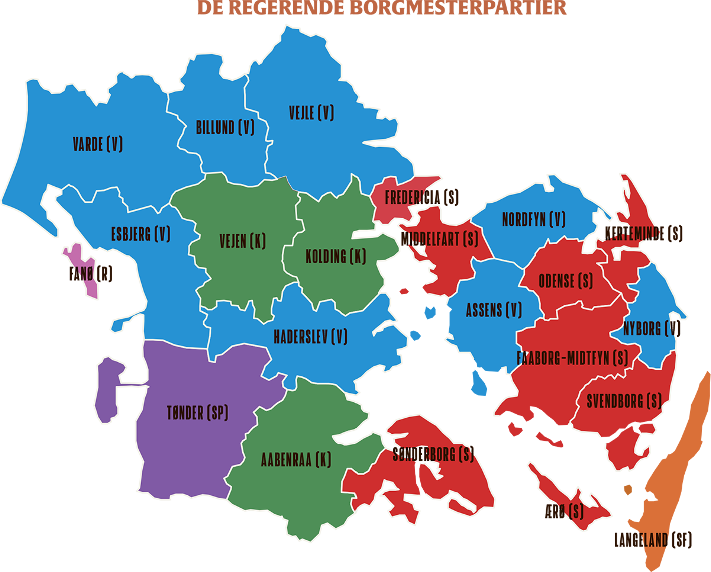 Både Venstre og Socialdemokratiet har 9 borgmesterposter i regionen.