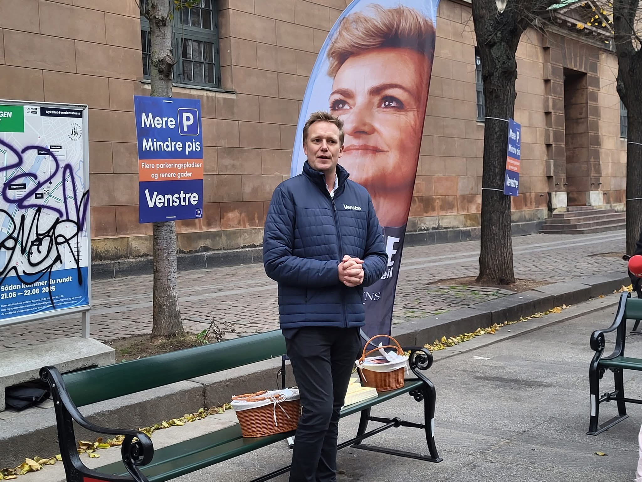 Her skal han og andre Venstre-kandidater sammen med partiformand Troels Lund Poulsen uddele æbler til forbipasserende.