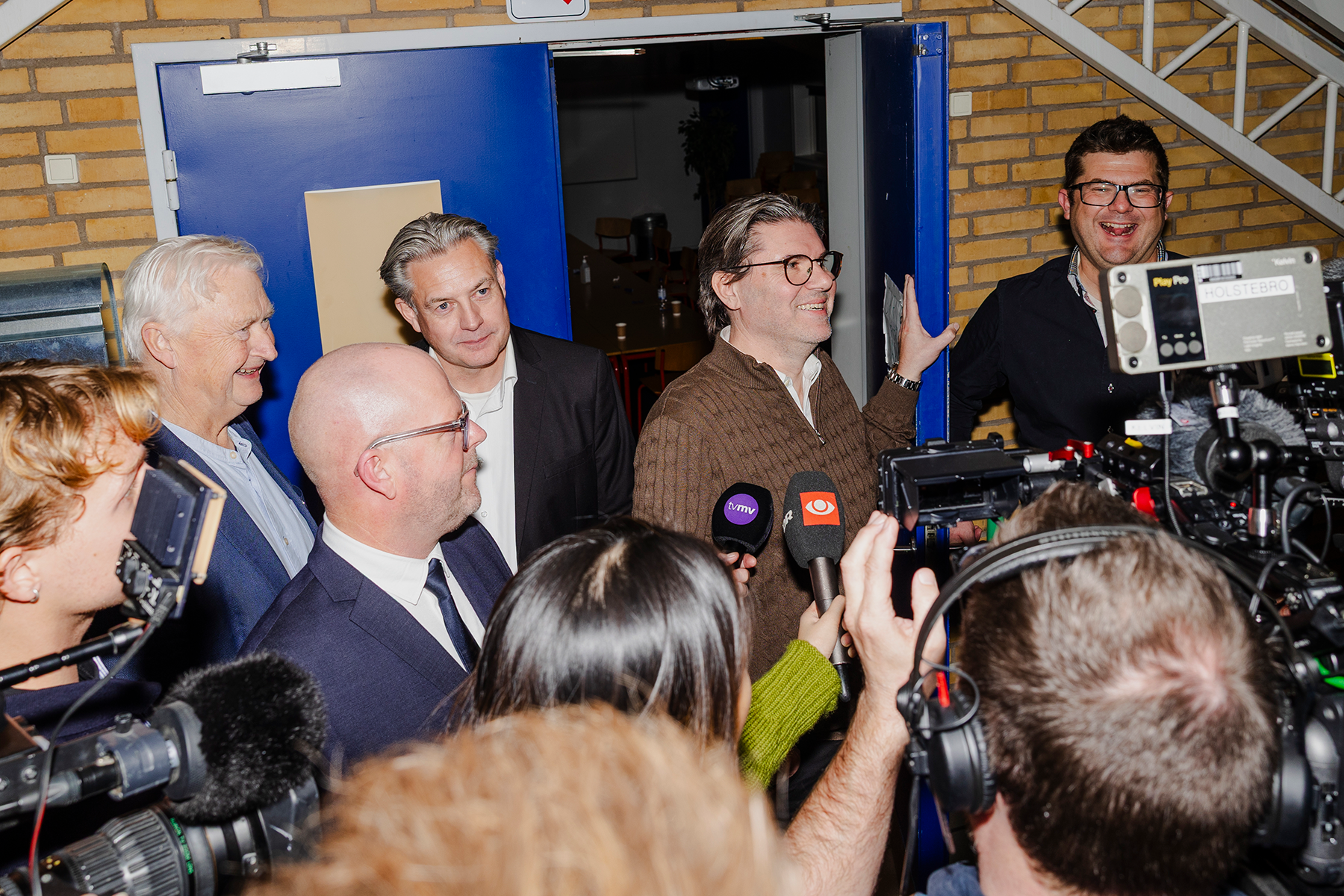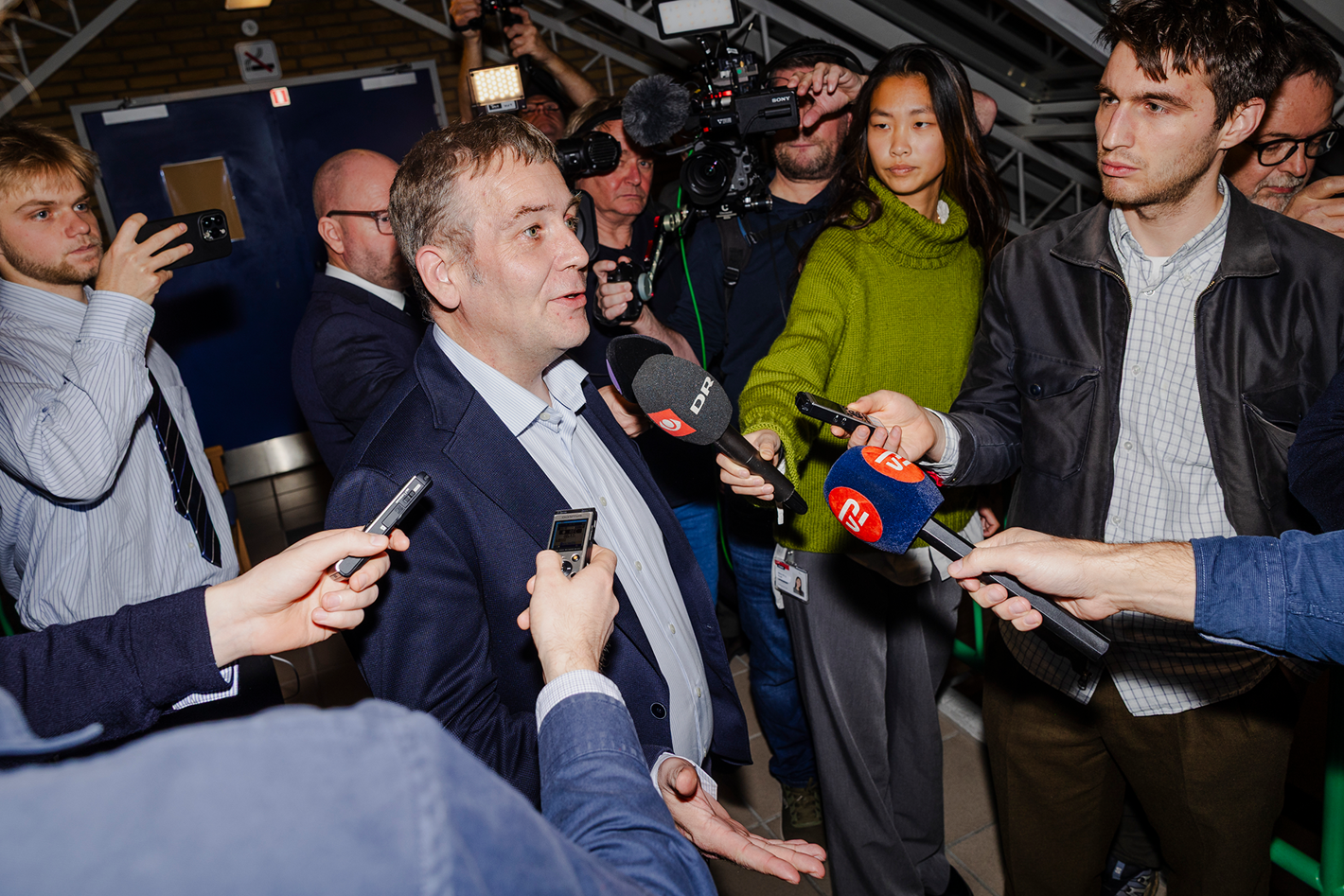 Pressen var stort set fast inventar foran Danmarksdemokraternes forhandlingslokale i løbet af valgnatten. Her foregik næsten alle forhandlinger. Foto: Anders Holst